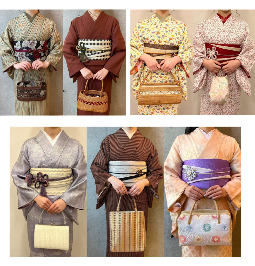 지갑, 휴대폰, 화장품, 모바일 배터리 등 인기 있는 바구니 가방이나 수놓은 가마쿠치 가방, 니시진 직물로 만든 주머니 등 다양한 가방을 준비하고 있습니다. 기모노 특유의 리큐백도 빼놓을 수 없죠.