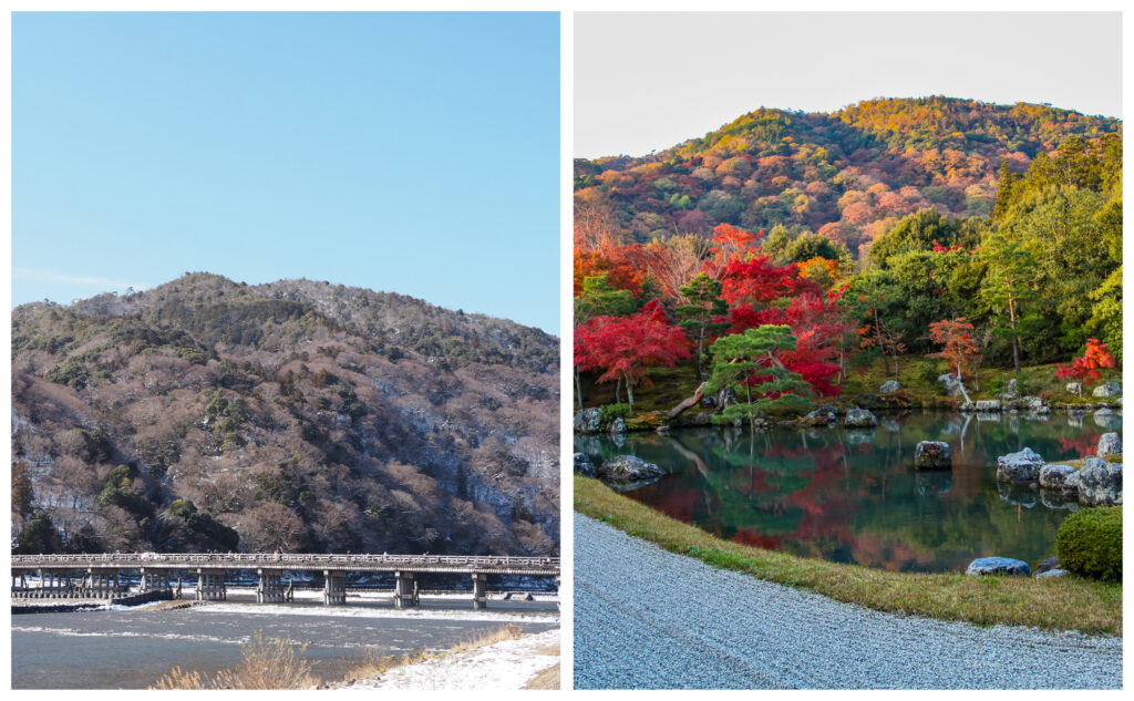 토게츠교(渡月橋)는 그 상징적인 존재로, 카츠라가와(桂川)에 걸린 이 다리는 봄의 벚꽃, 여름의 신록, 가을의 단풍, 겨울의 눈경치 등 사계절 내내 아름다운 풍경을 즐기실 수 있습니다.