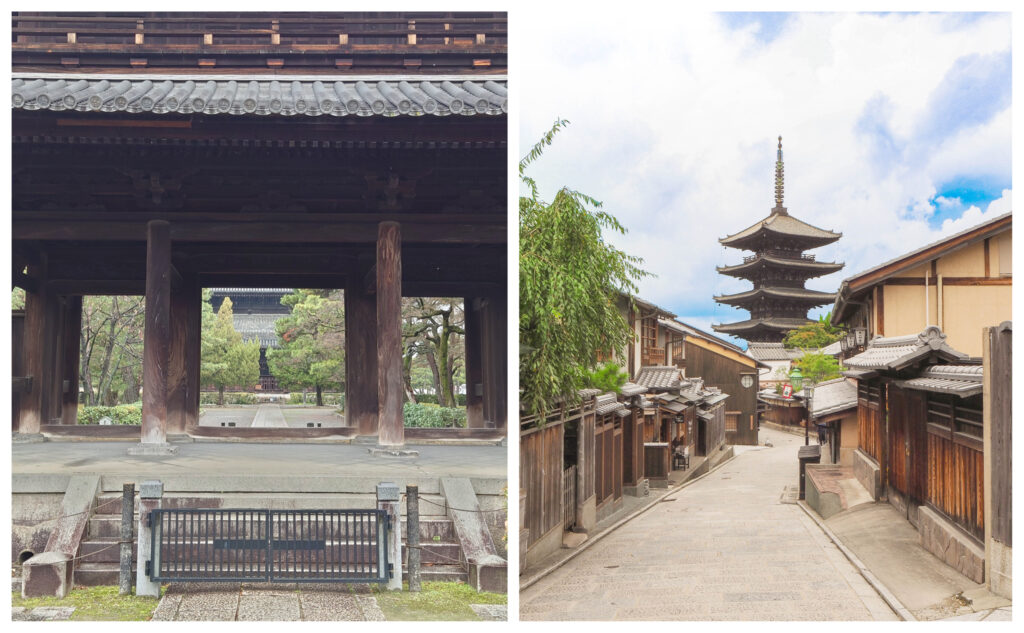 렌탈 기모노 오카모토 기요미즈 히가시야마점 주변에 위치한 켄닌지(建仁寺)는 교토에서 가장 오래된 선종 사찰로, 1202년에 에이시(영서)에 의해 창건되었습니다. 임제종 켄닌지파의 본산이며, 풍신과 雷神(번개와 천둥신) 그림이 그려진 병풍(풍경화) 등 많은 문화재를 소장하고 있습니다. 마른 연못 정원과 법당 천장에 그려진 '쌍룡도'도 볼거리입니다.