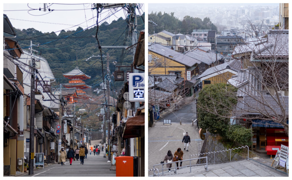기요미즈데라와 주변 명소로 가는 입구 역할을 하는 곳으로, 길가에는 교토 특유의 기념품 가게들도 늘어서 있어 관광 분위기를 한층 더 고조시켜줍니다.