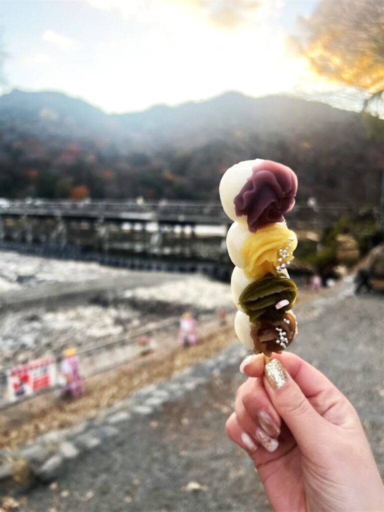 단고를 한 손에 들고 걸으면서 먹는 것도 좋고 🎵 nn가게 바로 앞의 계곡 강을 따라 잠시 앉아 산과 강을 바라보며 휴식을 취하는 것도 좋습니다 🤍 카츠라 강과 토게츠교를 배경으로 사진을 찍어보세요 📷 아라시야마 관광의 화려한 추억을 남겨보는 건 어떠세요? ✨