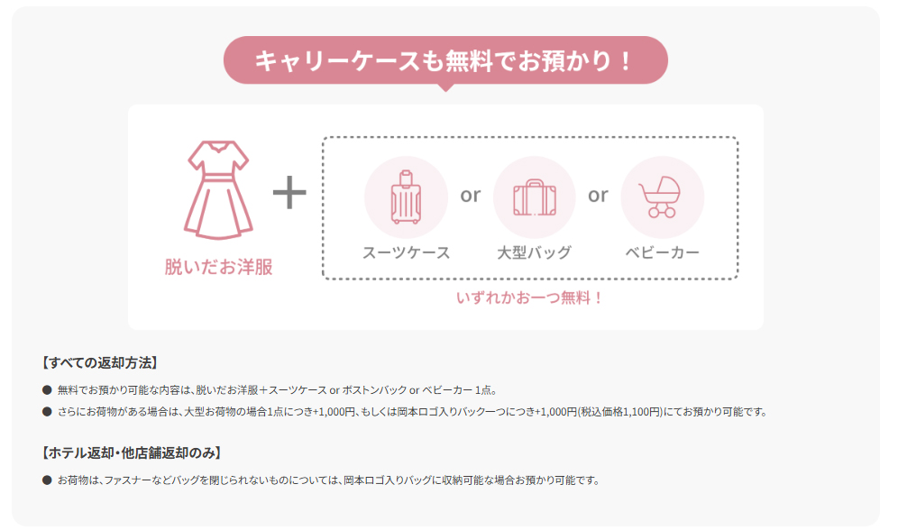 렌탈 기모노 오카모토에서는 1인당 1개씩 큰 짐을 무료로 보관해 드립니다.