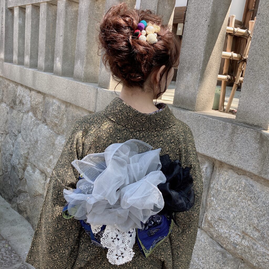 레이스와 퍼를 오비에 겹쳐 더하고, 액세서리나 브로치를 좋아하는 오비끈과 조합해 오비 장식으로♪