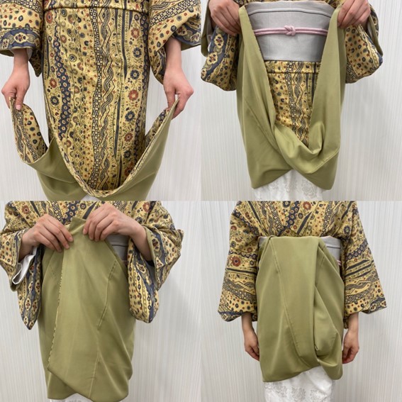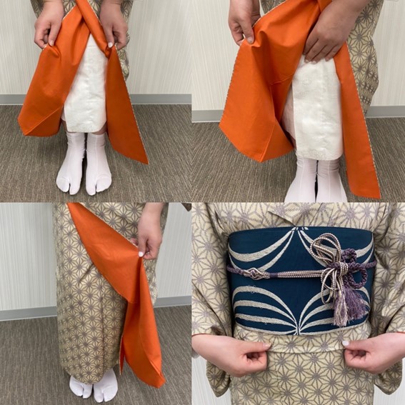 ・오비 높이까지 걷어 올린 후 오비에 끼우세요. 밑단이 쉽게 떨어지지 않도록 어느 정도 단단히 끼워 주세요.